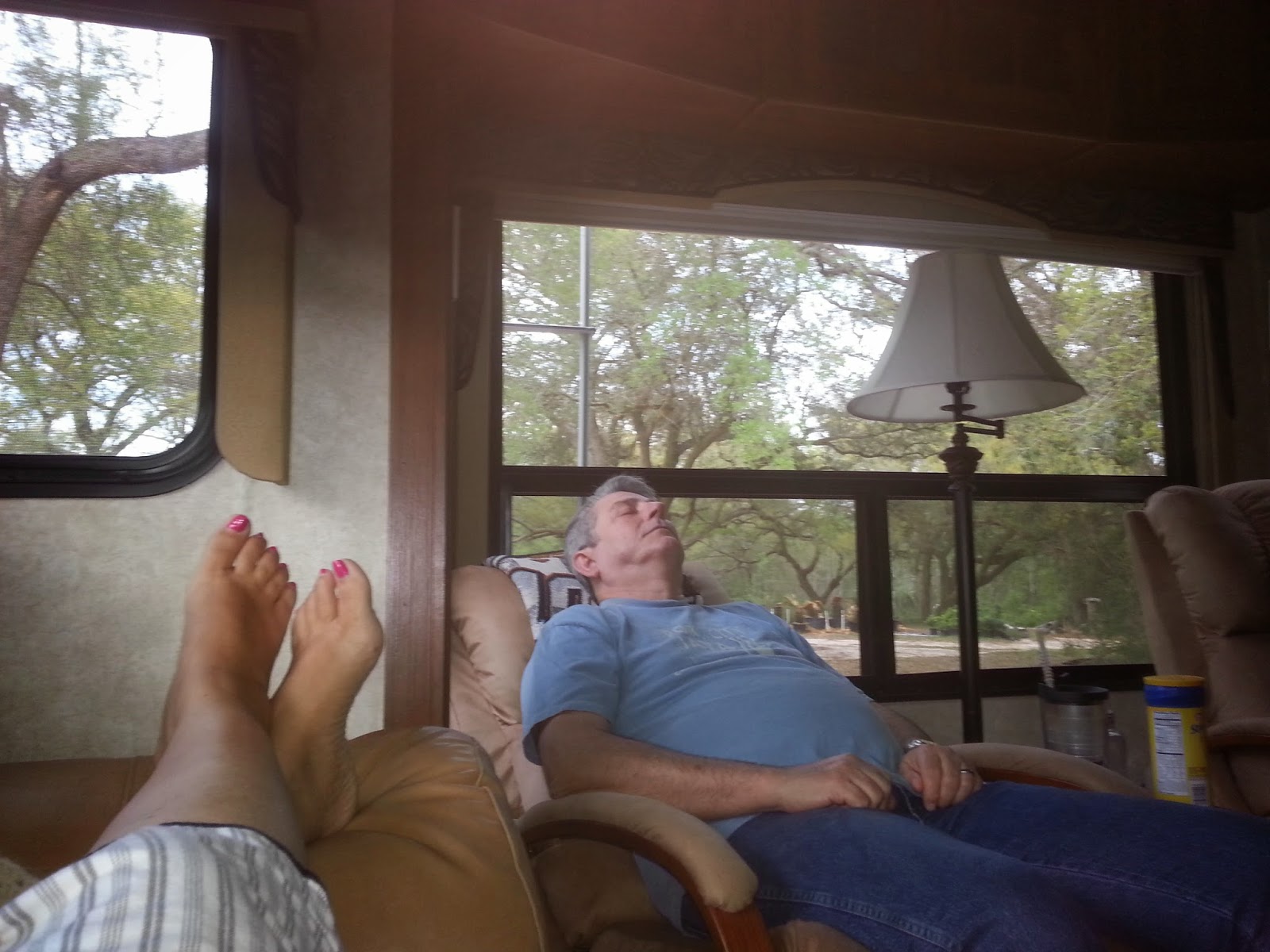 We sold the old furniture to the grandson of the people who own the RV Park where we are staying, but had our doubts whether or not we'd be able to get it through our twenty-eight inch door in one piece! It was touch and go for a bit and for a while my mind was thinking chainsaw! It took four guys to wrestle that heavy couch out the door, but they succeeded!